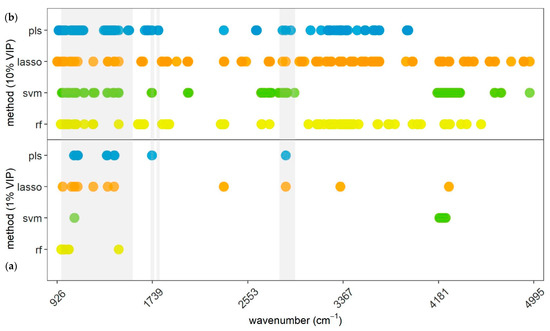 Representation of (a) 1% and (b) 10% of most important wavelengths for ketosis prediction selected by the respective method presented on the y-axis. PLS = partial least squares discriminant analysis; LASSO = least absolute shrinkage and selection operator; SVM = support vector machine; RF = random forest. Gray areas indicating most informative areas according to Grelet et al. [33].