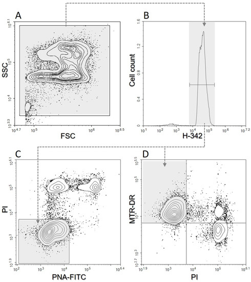 Illustration of the flow cytometric gating strategy. (A)—Side scattering vs. forward scattering. (B)—Cell count vs. Hoechst-33342 (H-342). (C)—Propidium Iodide (PI) vs. lectin PNA (PNA-FITC); the PAI (plasma membrane and acrosome intact sperm) region is shown in grey. (D)— MitoTracker™ Deep Red (MTR-DR) vs. PI; the MMP (mitochondrial membrane potential) region is shown in grey.