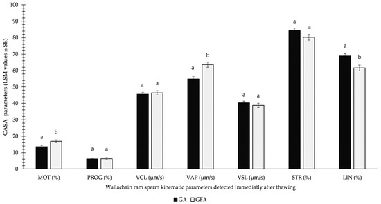 Influence of GA (glycerolation during the whole equilibration process) vs. GFA (glycerolation 10 min before the freezing procedure) on CASA parameters in Wallachian ram sperm detected immediately after equilibration; MOT: total motility; PROG: progressive motility; VCL: curvilinear velocity; VAP: average path velocity; VSL: straight-line velocity; STR: straightness; LIN: linearity; a–b: different letters within particular parameters indicate significant differences at a p < 0.05 level of significance.