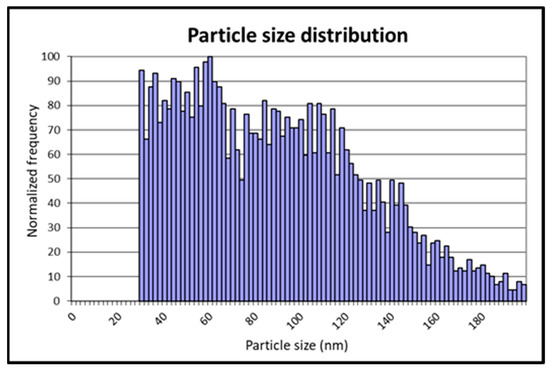 The average, mode, and median diameters obtained by spICP-MS analysis (Figure 1) were 125, 90, and 130 nm, respectively, and the size distribution is shown in Figure 2.