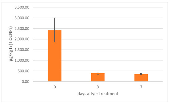 TiO2NPs used in the in vivo experiment were characterized by spICP-MS (Figure 1 and Figure 2). The average, mode, and median diameters of the TiO2NPs (125, 90, and 130 nm, respectively) were in line with those obtained in another study conducted in our laboratory [7], confirming the efficacy of the dispersion protocols used.