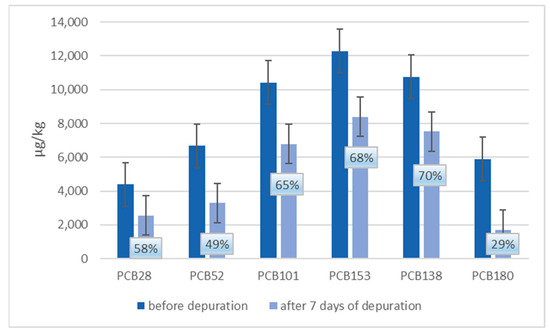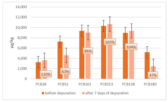 In Figure 5 and Figure 6, a comparison between ndl-PCBs concentration in mussels treated with ndl-PCBs only (groups 3 and 4 merged) and mussels treated with ndl-PCBs and TiO2NPs (group 4–5 merged), before and after the depuration process, are presented. In each figure, the percentage of ndl-PCBs detected after the depuration process is also reported.