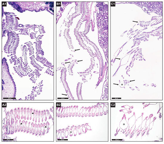 (A1): Gill ctenidial laminae from the control group, showing homogenous gill filament structure with hemolymphatic spaces of normal size (4×). (A2): detail of normal gill filaments from control (group 1–2) (10), hemolymphatic spaces appear normal (arrowheads). (B1): ctenidial laminae from the ndl-PCBs-treated group (4×), moderate dilatation of hemolymphatic spaces (arrows). (B2): detail of gill filaments from the ndl-PCBs-treated specimens (group 3–4) with moderate dilatation of the hemolymphatic spaces (*) (10×). (C1): ctenidial laminae of TiO2NPs and ndl-PCBs -treated group (4×), severe dilatation of the hemolymphatic spaces (arrows). (C2): detail of gill filaments of TiO2NPs and ndl-PCBs-treated specimen (group 5–6) with strongly dilated (*) hemolymphatic space (10×).