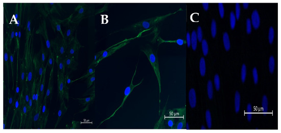 The fibroblasts isolated from healthy endometria (Kenney and Doig’s category IIA endometria) were isolated according to Szóstek-Mioduchowska et al. [50]. In the laboratory, the uterine lumen was washed three times with 10 mL of sterile Hanks’ balanced salts (HBSS; H1387; Sigma-Aldrich, Saint Louis, MO, USA) containing 0.01% of antibiotic/antimycotic (AA) solution (AA5595; Sigma Aldrich, Saint Louis, MO, USA). The uterine horns were split open with scissors to expose the endometrial surface. Endometrial strips were excised from the myometrium layer with a scalpel, washed once with sterile HBSS containing 0.01% of AA solution, and sliced with a scalpel into small fragments (1–3 mm). A single digestion of the minced tissues was performed by agitation for 45 min, in 100 mL of sterile HBSS with 0.05% (w/v) collagenase I (C2674, Sigma-Aldrich, Saint Louis, MO, USA), 0.005% (w/v) DNase I (11284932001; Roche-Sigma Aldrich, Saint Louis, MO, USA), 0.01% AA, and 0.1% (w/v) bovine serum albumin (BSA; A9418, Sigma Aldrich, Saint Louis, MO, USA). Afterwards, to extract undigested tissue fragments, filtration of the cell suspension was accomplished with 70 μm and 40 µm filters. The filtrate was mixed gently with 1 mL of Red Blood Cell Lysing Buffer Hybri-Max™ (R7757; Sigma-Aldrich, Saint Louis, MO, USA) to lyse red blood cells. Afterwards, the filtrate was washed three times by centrifugation (4 °C, 100× g, 10 min) in HBSS supplemented with antibiotics and 0.1% (w/v) BSA. The final pellet of endometrial cells was resuspended in FBMTM Basal Medium (CC-3131, LONZA, Basel, Switzerland) supplemented with FGMTM-2 SingleQuotsTM, ascorbic acid (100 ng/mL; A4544; Sigma-Aldrich, Saint Louis, MO, USA) and 0.01% of AA solution. A hemocytometer was used to perform cell count. The trypan blue exclusion test was employed to assess the viability of endometrial cells, which was higher than 95%. The immunofluorescent staining for vimentin was utilized to evaluate the homogeneity of fibroblasts, based on the protocol described [51] (Figure 1). The cells were then independently seeded, at a density of 1 × 105 viable cells/mL and incubated at 38.0 °C in a 5% CO2 atmosphere. The medium was replaced 18 h after plating, to purify fibroblast population. At that time, the selective attachment of fibroblasts had taken place and elimination of other types of endometrial cells was possible. The medium was replaced until the cells achieved confluence, every 48 h. Fibroblast purity after isolation was approximately 96%. After reaching 90% of confluency, the cells were cryopreserved, as described previously [52].