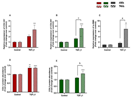 Relative levels of (A) collagen type I (COL1A1), (B) collagen type III (COL3A1), and (C) α-smooth muscle actin (α-SMA) mRNA, and of (D) COL1 and (E) COL3 protein concentrations in mare endometrial fibroblasts after incubation with TGF-β1 (10 ng/mL) for 48 h and 96 h; n = 5. All values are expressed as percentage of change from respective hour control (non-treated fibroblasts). Bars represent mean ± SEM. Asterisks indicate significant differences between treatment and the respective control (** p < 0.01, *** p < 0.001, **** p < 0.0001); a and b letters indicate significant differences between treatment hours (a—p < 0.05; b—p < 0.01; c—p < 0.001).