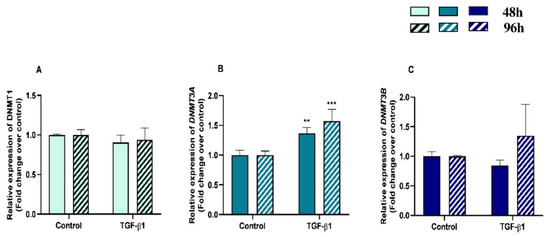 Relative DNA methyltransferases ((A)—DNMT1, (B)—DNMT3A, and (C)—DNMT3B) mRNA levels in mare endometrial fibroblasts after incubation with TGF-β1 (10 ng/mL) for 48 h and 96 h; n = 5. All values are expressed as percentage of change from respective hour control (non-treated fibroblasts). Bars represent mean ± SEM. Asterisks indicate significant differences from the respective control (** p < 0.01, *** p < 0.001).