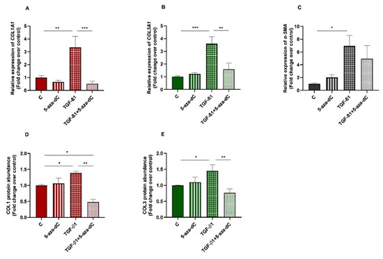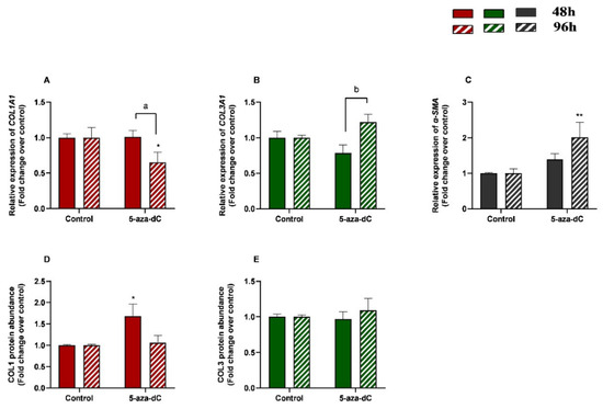 The effects of treatment time, 5-aza-dC treatment, and their interaction (time × treatments) were also studied. Significant interactions between time and 5-aza-dC treatment were observed for COL1A1 (p = 0.0388) and COL3A1 (p = 0.0078) mRNA levels. No interactions were found for α-SMA transcripts (p = 0.0746), COL1, or COL3 protein concentrations (p = 0.0623; p = 0.5382, respectively).