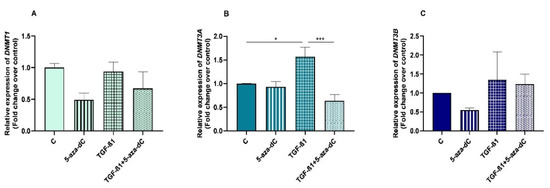 After administration of 5-aza-dC to the TGF-β1-treated fibroblasts, a decrease was observed in DNMT3A mRNA levels (p < 0.001) (Figure 5B). No alterations were found either on DNMT1 or DNMT3B mRNA levels after administration of 5-aza-dC to the TGF-β1-treated fibroblasts (Figure 5A,C).