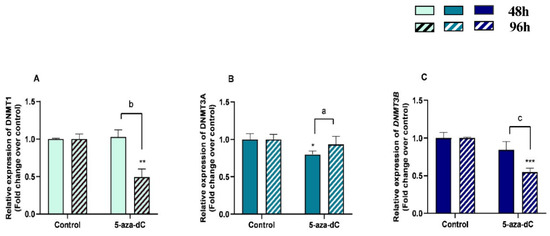 There was a decrease in mRNA levels of DNMT1 and DNMT3B at 96 h (p < 0.01; p < 0.001, respectively) and of DNMT3A at 48 h (p < 0.05) (Figure 7A–C). An increase of DNMT3A mRNA levels (p < 0.01) and a decrease of DNMT1 and DNMT3B mRNA levels between 48 h and 96 h treatment (p < 0.001) were also observed (Figure 7A–C).