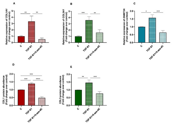 Relative levels of (A) collagen type I (COL1A1), (B) collagen type III (COL3A1), and (C) DNA methyltransferase 3A (DNMT3A) mRNA, and of (D) COL1 and (E) COL3 protein concentrations in non-treated (control-C) endometrial fibroblasts or treated with TGF-β1 (10 ng/mL) for 96 h or TGF-β1 (10 ng/mL) + 5-aza-dC (1 µM) (TGF-β1 followed by 5-aza-dC at 48 h—total cell incubation of 96 h); n = 5. Bars represent mean ± SEM. Asterisks indicate significant differences between treatments (* p < 0.05, ** p < 0.01, *** p < 0.001, **** p < 0.0001).