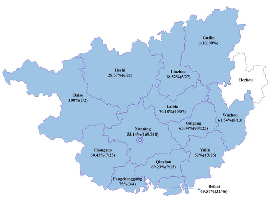 Map of PEDV distribution in pigs in 13 regions of Guangxi, China. The positive rates of PEDV infection are labeled for the regions. No clinical samples were collected from Hezhou.