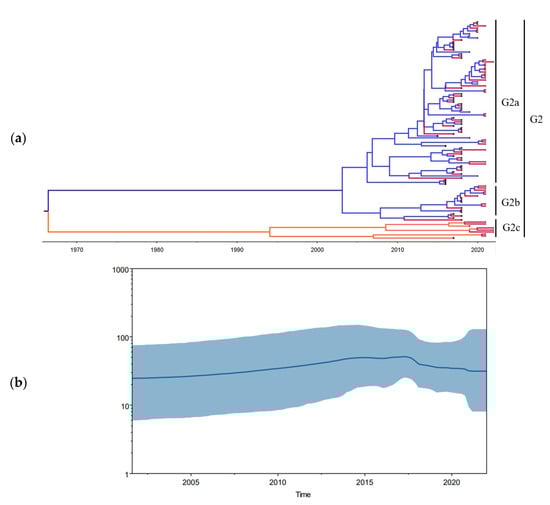 The maximum clade credibility (MCC) trees of the partial S1 gene sequences of PEDV strains found in Guangxi during 2015–2022. (a) The MCC tree was created using BEAST version 1.8.3 software; the Guangxi PEDV strains are marked with red nodes. Bayesian skyline plot of partial S1 gene sequences of PEDV strains. (b) Dark blue lines represent mean value of genetic diversity; light blue shading represents 95% confidence intervals.