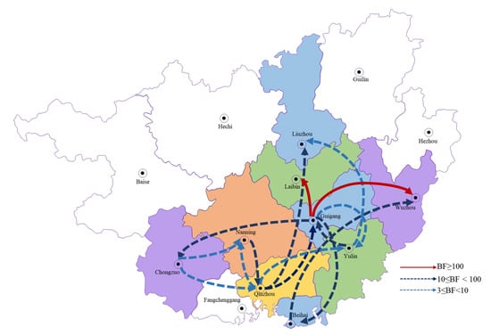 Guangxi is divided into 14 regions and the sequences collected in this study came from 9 of these (namely Liuzhou, Laibin, Wuzhou, Guigang, Nanning, Chongzuo, Qinzhou, Yulin and Beihai). The spread circulation of PEDVs in Guangxi was estimated by BSSVS analysis. The 15 migration links in the spread of PEDVs in Guangxi were found by Bayesian phylogeographic analysis. Among them, Guigang–Laibin (BF ≥ 1000) and Guigang–Wuzhou (BF = 493) were identified with decisive support and very strong support, respectively. There were also seven other routes identified with strong support and six others were identified with indicated statistically significant support (Figure 4).