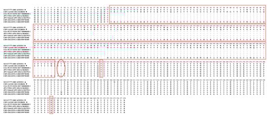 The alignment of amino acid sequences in the partial S1 protein of PEDVs in the Guangxi and reference strains. The deletions and mutations in the partial S1 protein of PEDV identified are shown in red boxes for the partial S1 protein.