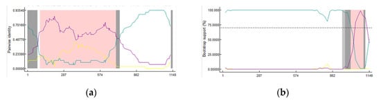Recombinant analyses were performed by using RDP4 software based on the PEDV partial S1 genes and the results revealed that there were two types of recombination events (Figure 7 and Table 3). The 19-GXBH-2 strain arose from recombination events between the PEDV-7C (G2a) and SC-L (G1a) strains and breakpoints for potential recombination were found in 54–703 nt (Figure 7a). The other strain, 18-GXNN-6, had a different type of recombination event (Figure 7b), where the zones out of the breakpoint 1004–1106 nt exhibited a greater similarity with CH/SCAZ10 (G2a). In addition, the zone between the breakpoint 1004–1106 nt had high levels of similarity with the CH/S (G1a) strain. These results suggest that strains 18-GXNN-6 and 19-GXBH-2 were the results of natural recombination events between the G2a and G1a subgroups.