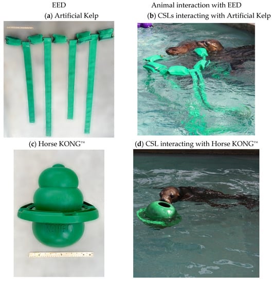 Most EEDs used with marine mammals are floating objects [53], rather than being neutrally buoyant in the water column, or negatively buoyant in sinking to the bottom of a pool. In the context of rehabilitation, the challenge EEDs provide is ideally relevant for post-release success, intrinsically motivating, and possible to master, e.g., such as diving, breath holding and apprehending objects with animals’ mouths. Floating toys catch an animal’s interest immediately, but subjects may quickly become less interested in them [54]. Thus, by providing EEDs which sink to the bottom, such as the Horse KONG™, and including a combination of parts that float at the surface while also hanging in the water column such as the Artificial Kelp and the Wubba KONG™, we were able to provide different opportunities from the surface to the bottom of pools.
