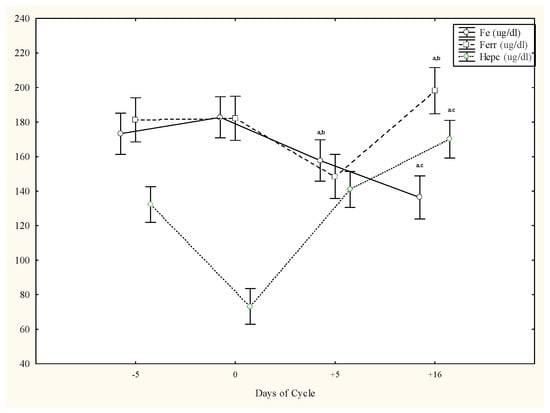 Circulating iron, ferritin, and hepcidin concentrations (mean ± SD) in cycling Spanish Purebred mares. Letters indicate significant differences among days: a vs. −5; b vs. 0; c vs. +5 (p < 0.05).