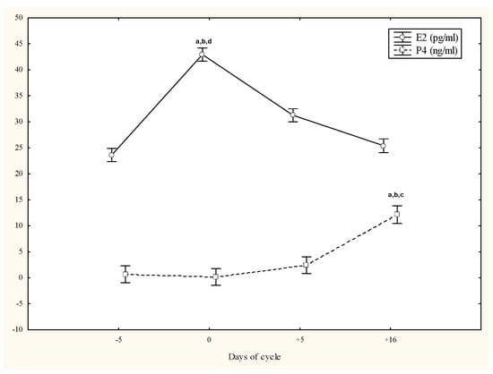E2 concentrations were higher on day 0 than on days −5, +5 and +16 (p < 0.05), while P4 concentrations were higher on day +16 than on days 0 and +5 (p < 0.05) (Figure 2).