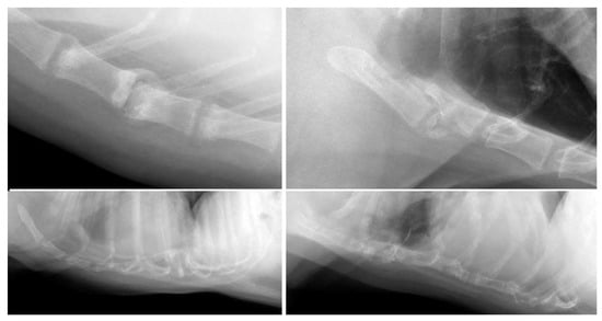 - Thrall, D.E.; Robertson, I.D. Atlas of Normal Radiographic Anatomy & Anatomic Variants in the Dog and Cat, 2nd ed.; Elsevier: St. Louis, MO, USA, 2016; pp. 203–205. [Google Scholar]