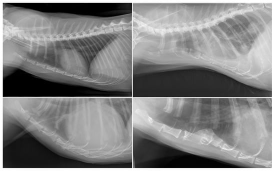 (Top left) panel: Example of a left lateral radiograph of a cat with a sternum that was considered normal. (Bottom left): Abnormal low number of sternebrae in a 12-year-old female Domestic Shorthair. A total of six individual sternebrae are present, caused by fusion of the fifth and sixth sternebrae and an absence of the seventh sternebra. (Top right): Pectus excavatum in an 11-year-old female neutered Domestic Shorthair. (Bottom right): Chronic subluxation of the fourth sternebra in an 11-year-old male neutered Domestic Shorthair. The fourth sternebra is displaced dorsally and fused with the third sternebra.