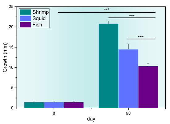 Growth rates of crabs according to different feeding regimes: shrimp Penaeus vannamei (Group 1), squid Mastigoteuthis flammea (Group 2), and tilapia Oreochromis niloticus (Group 3). Feeding period = 90 days. Feeding times = twice a day. Amount of food = 0.001 g per mL. *** p < 0.001.
