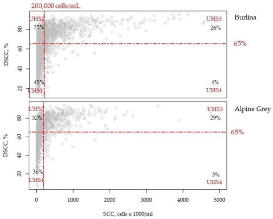 Distribution of milk test-day records across the four udder-health status (UHS) groups identified in the two breeds by mean of specific cut-offs (in red). The amount (%) of milk test-day records is reported in each quadrant (in black). Records were classified according to somatic cell count (SCC) and differential somatic cell count (DSCC, combined proportion of polymorphonuclear neutrophils and lymphocytes out of the total SCC) as follows: UHS1 if SCC ≤ 200,000 cell/mL and DSCC ≤ 65%, UHS2 if SCC ≤ 200,000 cell/mL and DSCC > 65%, UHS3 if SCC > 200,000 cell/mL and DSCC > 65%, and UHS4 if SCC > 200,000 cell/mL and DSCC ≤ 65%.