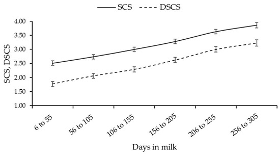 Both least squares means of SCS and DSCS were similar in the two breeds (Table S1); however, the estimated DSCC was greater in Alpine Grey (66.2 ± 0.8%) than Burlina (63.2 ± 0.6%). Although lactation stage was significant for both SCS and DSCS (Figure 2), the interaction between lactation stage and breed was not (Table S1).