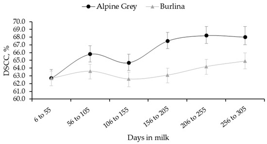 The lowest SCS and DSCS were observed in early lactation, whereas the greatest at the end. The two breeds showed different patterns of DSCC (p < 0.05) throughout DIM (Figure 3), with Alpine Grey having the minimum in early lactation (62.5 ± 1.1%), a peak corresponding with the MY lactation peak (Figure 3; 66.2 ± 1.1%) and a subsequent drop between 106 and 155 DIM followed by a second increase and stabilization. On the contrary, least squares means of DSCC were similar across lactation stages in Burlina cows, with a mild peak in correspondence of the MY lactation peak (Figure 3).