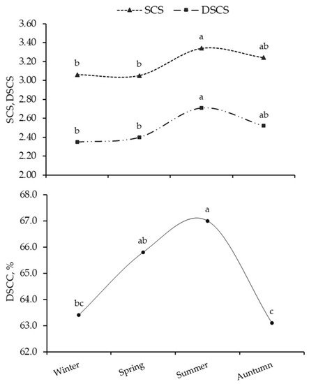 Season of sampling—but not its interaction with the breed—affected the SCS, DSCC, and DSCS variability (Table S1, Figure 4). Least squares means were generally the greatest in summer (SCS = 3.34 ± 0.09; DSCS = 2.71 ± 0.10), except for DSCC whose seasonal trend looked different, being characterized by a single peak in summer (66.6 ± 0.6%) and a drop in autumn (63.3 ± 0.7%).