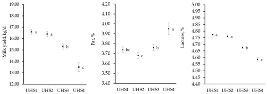 In both breeds, the UHS significantly affected daily MY and composition. The interaction between UHS and breed was in fact significant for protein and casein, BHB, and urea, whereas there was only a tendency for the casein-index (Table S2). Least squares means of Burlina MY (16.10 ± 0.24 kg/d) was greater compared to Alpine Grey (15.30 ± 0.32 kg/d) and MY differed according to the UHS group (Figure 5).