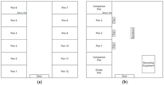 Figure 1a) consisted of 12 pens (6 pens on either side of the room) that were 2 m deep × 1 m wide and made with wire mesh and wood frames. Here, floor pen litter was approximately 5 cm deep, and hens also had access to nest boxes (1 nest box per pen). The first 19 hens were housed in 7 pens of 2 birds each and 5 pens of a single bird each. Birds were housed individually or in pairs based on their behaviour and signs of feather pecking to maximize welfare and comfort, and they always had visual and auditory contact with neighbouring birds. Bird weight and condition was used to determine which birds were to be used as experimental animals, with the lightest birds and those with the worst feather condition being used as companion animals. As the total number of birds in the holding room decreased, paired birds identified as experimental hens were separated into individual pens. Birds in batch 4 were added after birds 1–3 had been moved to the experimental room.