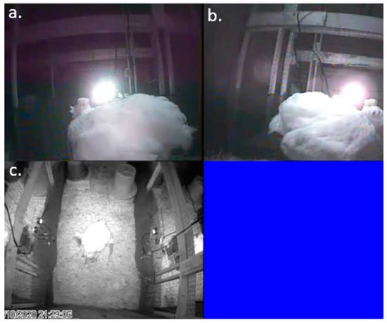 Each experimental pen was outfitted with three infrared cameras: two H.264 CCTV IMX323 night vision IR mini cameras (Ailipu Technology Co., Ltd.; Shenzhen, China) on either side of the perch and a third high-resolution varifocal camera (Twilight CCTV; Merseyside, UK) pointing downwards from the top of the pen to capture the entire enclosure in frame (