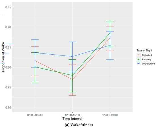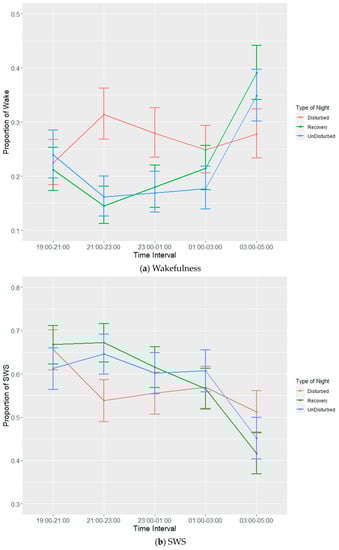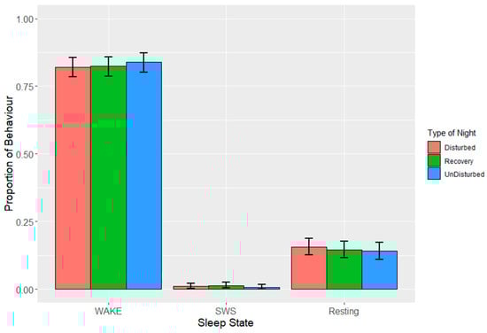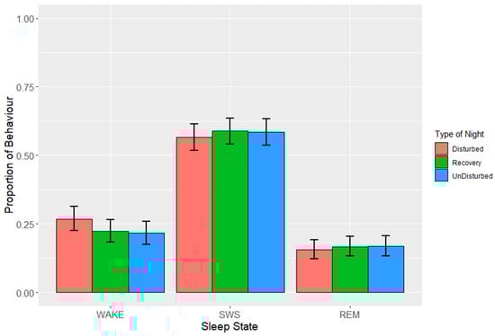 > 0.25 was omitted from further analysis after visual inspection of distributions. The counts for each sleep state were calculated for each bird in each interval from which proportions were calculated. Each 24 h period starting at lights off was classified by ‘type of night’, where experimental nights were categorized as either ‘disturbed’, ‘recovery’ or ‘undisturbed’ depending on whether disturbances were applied. In order to normalise residuals, proportions of sleep behaviours were angular transformed prior to fitting linear mixed models (LMMs). LMMs were applied separately for each sleep state and for lights off and lights on. Fixed effects were time interval, type of night and the interaction between them, and random effects were batch, bird, experimental day and time interval within experimental day. The reverse order of factors was also tested to ensure the results were similar.