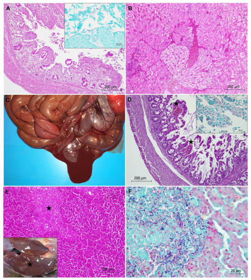 Colibacillosis (A,B) and clostridiosis (C–F) in Cantabrian capercaillies. (A) Typhlitis due to Escherichia coli infection is observed, characterized by epithelial cell damage of the mucosa and inflammatory infiltrate. Hematoxylin-eosin stain. Inset: Gram-negative bacilli compatible with E. coli are present on the apical surfaces of mucosal epithelial cells. Gram stain. (B) Congestion and hemorrhage in kidney of an animal with colibacillosis. Hematoxylin-eosin stain. (C) Hemorrhagic enteritis is observed in a capercaillie with Clostridium perfringens infection. (D) Histological features in the intestine of a capercaillie with clostridiosis. Necrotic typhlitis is observed; stars indicate hemorrhages. Destruction of intestinal mucosa and network of fibrin are also detected. Hematoxylin-eosin stain. Inset: Presence of numerous Gram-positive bacilli adhered to the mucosal epithelium are shown. Gram stain. (E) Necrotic hepatitis with a focus of necrosis (star) in the liver parenchyma is observed. Hematoxylin-eosin stain. Inset: Multiple whitish-yellowish foci of necrosis (star) are observed in the liver. (F) Numerous Gram-positive bacilli compatible with Clostridium spp. are located in the focus of necrosis observed in (E). Gram stain.