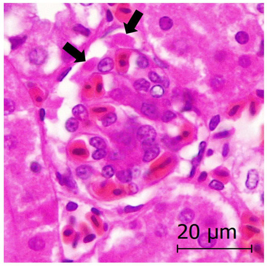 Stress-related neurogenic shock in a Cantabrian capercaillie. Disseminated intravascular coagulation-DIC (i.e., microthrombi, arrows) in a renal glomerulus is observed.