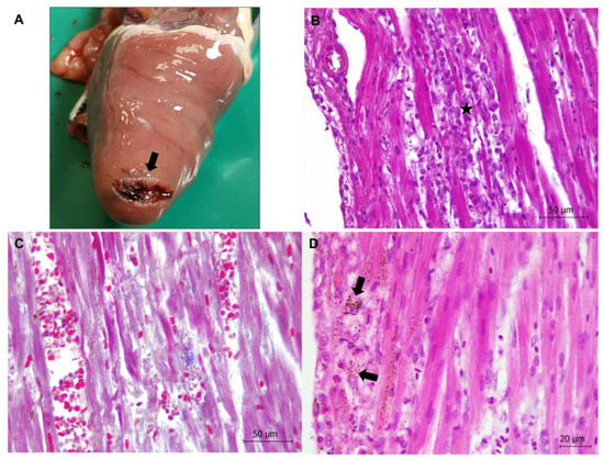 Rupture of the heart apex and cardiomyopathy in a Cantabrian capercaillie. (A) Rupture of the heart apex with associated hemorrhage is observed (arrow). (B) Fragmentation of myocardial fibers, as well as prominent inflammatory infiltrate mainly made up of macrophages (star), can be observed. Hematoxylin-eosin stain. (C) Myodegeneration is highlighted using Mallory Azan staining. Only the unaffected fibers are stained in red. (D) Calcification (mineralization) (in black, arrows), hyalinization, necrosis of muscle fibers, and an infiltrate of macrophages are observed. Von Kossa stain.
