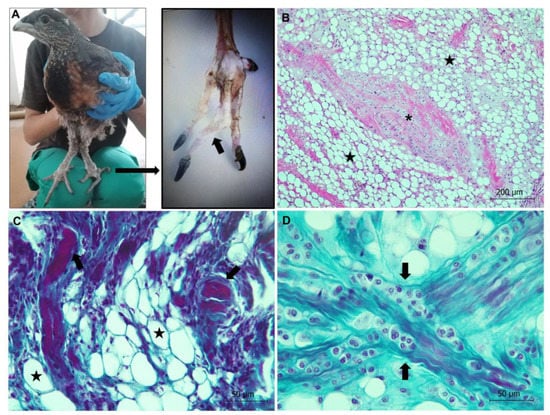 Valgus leg deformity in a Cantabrian capercaillie. (A) The left leg is bent outwards at the hock joint (left image). The animal also shows lateral tilting of the distal tibiotarsal condyles (arrow, right image). (B) Myotonic dystrophy (stars) and fibrous cartilaginous metaplasia (asterisk) are observed in the region of the tendon and skeletal muscle associated with the femoral head. Hematoxylin-eosin stain. (C) Degeneration of muscle fibers that are atrophied (in red, arrows) and replaced by adipose tissue (stars) is observed using Masson´s trichrome stain. (D) Detail of the fibrous cartilage metaplasia, where chondrocytes are organized forming parallel rows between the collagen bundles (arrows). Masson´s trichrome stain.