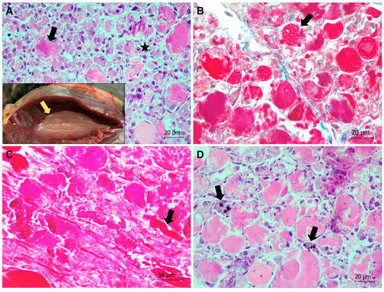 Severe exertional myopathy in a Cantabrian capercaillie in the supracoracoideus muscle. (A) Extensive segmental hyaline degeneration in the supracoracoideus muscle. Coagulative necrosis, areas of myofibrillar lysis (black arrow), as well as intensive inflammatory infiltrate mainly consisting of lymphocytes and macrophages (star) are observed. Hematoxylin-eosin stain. Inset: Gross appearance of the supracoracoideus muscle, which appears pale and dry (yellow arrow). (B) Hypercontracted, necrotic, and lysed myofibers are highlighted using Mallory Azan stain (arrow). (C) Segmental degeneration and inflammatory infiltrate in a longitudinal section of supracoracoideus muscle. Surviving myofibers can be seen in red (arrow). Mallory Azan stain. (D) Calcification (mineralization) (in black, arrows), hyalinization, and necrosis of muscle fibers are observed. Von Kossa stain.