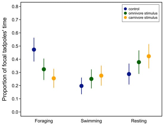 Proportion of focal intermediate tadpoles’ behaviors after introduction of an additional omnivore or carnivore competitor. Filled symbols represent mean proportion for each behavior and vertical lines represent 95% confidence intervals from the fitted model. See Table 1 for contrasts.