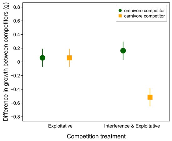 Differences in growth rate between intermediate morph focal tadpoles and their competitor. Filled symbols represent predicted mean growth and vertical lines represent 95% confidence intervals from the fitted model. See Table 2 for contrasts.