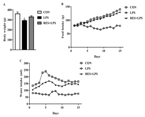 (A) Body weight, (B) feed intake, and (C) water intake of Control (CON), Lipopolysaccharide (LPS) and Resveratrol (RES) groups. Levels were significantly decreased in the LPS-fed group compared with the CON and RES+LPS groups. No significant difference was observed for the CON vs. LPS+RES group comparison. * p < 0.05, LPS vs. CON.