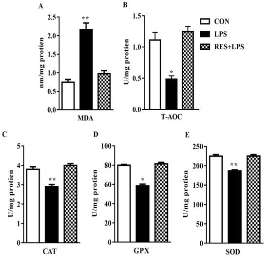 Malondialdehyde (MDA) level increased dramatically (p < 0.002; Figure 1A), whereas total antioxidant capacity (T-AOC) substantially declined (p < 0.04; Figure 1B) in the mammary tissue samples of mice in comparison with the CON group. Ultimately, these changes were totally reversed by resveratrol, as observed in the RES group in contrast to LPS. No significant changes were observed between the CON or RES groups (Figure 2).