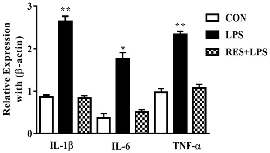 The mRNA expressions in mammary tissues were substantially upregulated by LPS in comparison with the CON group. Meanwhile, these mRNA levels were reversed by resveratrol, as observed in the comparison between the RES and LPS groups (Figure 4).