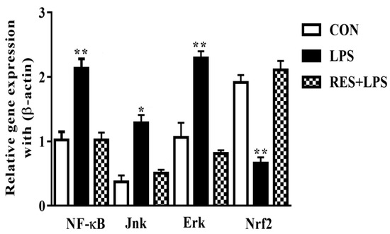 The mRNA expressions of NF-κB, Jnk, Erk, and Nrf2 in mammary tissue of female mice. NF-κB, JNK, and ERK levels were significantly different in the LPS group, while the Nrf2 mRNA expressions were significantly different in the LPS group in contrast to the CON and LPS+RES groups. * p < 0.05 significant and ** p < 0.005 highly significant.