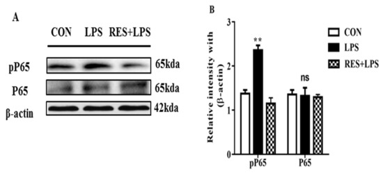 (A) Immunoblots and (B) quantification of pP65 and P65 in LPS in comparison with CON and RES+LPS groups. ns: not significant and ** p < 0.005 highly significant.
