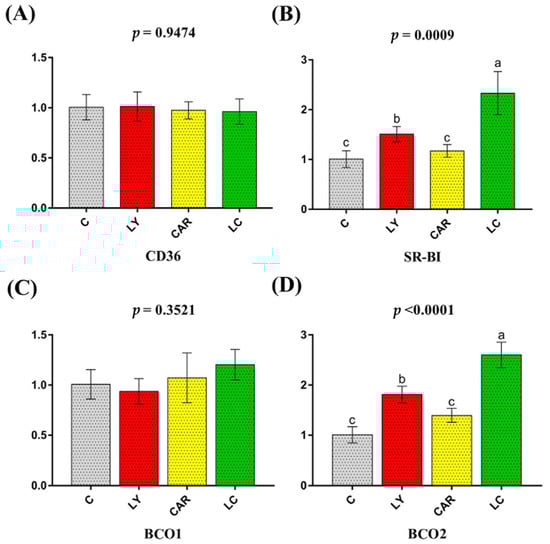 Relative mRNA expression of duodenal genes related to Lycopene uptake. (A), CD36; (B), SR-BI; (C), BCO1; (D), BCO2. Data are presented as mean value ± SEM (n = 3). Values without the same letter (a, b, c) represent statistically significant differences (p < 0.05). Abbreviations: C, Roosters fed a basal diet; LY, Roosters fed a basal diet supplemented with 400 mg/kg Lycopene; CAR, Roosters fed a basal diet supplemented with 150 mg/kg L-Carnitine; LC, Roosters fed a basal diet supplemented with (400 + 150) mg/kg Lycopene and L-Carnitine in combination.