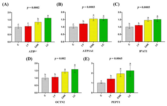 Relative mRNA expression of candidate nutritional transport genes in the duodenum. (A), ATB0,+; (B), ATP1A1; (C), B0AT1; (D), OCTN2; (E), PEPT1. Data are presented as mean value ± SEM (n = 3). Values without the same letter (a, b, c) represent statistically significant differences (p < 0.05). Abbreviations: C, Roosters fed a basal diet; LY, Roosters fed a basal diet supplemented with 400 mg/kg Lycopene; CAR, Roosters fed a basal diet supplemented with 150 mg/kg L-Carnitine; LC, Roosters fed a basal diet supplemented with (400 + 150) mg/kg Lycopene and L-Carnitine in combination.