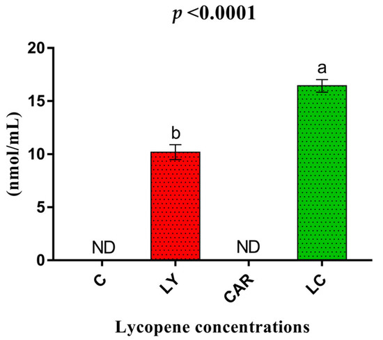 The effects of Lycopene levels in Roosters Serum are displayed in Figure 3. Our results reveal that the Lycopene levels were detected and showed a significant existence compared to the C and CAR groups (p < 0.05). Interestingly, the LC group had a significant increase in serum Lycopene levels compared to the LY group (p < 0.05). At the same time, the Lycopene was not detected in C and CAR groups.