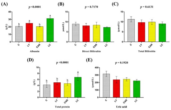 Effects of Antioxidants combination supplementations on the serum biochemical indexes of Roosters. (A), Albumin; (B), Direct Bilirubin; (C), Total Bilirubin; (D), Total protein; (E), Uric acid. Data are presented as mean value ± SEM (n = 8). Values without the same letter (a, b) represent statistically significant differences (p < 0.05). Abbreviations: C, Roosters fed a basal diet; LY, Roosters fed a basal diet supplemented with 400 mg/kg Lycopene; CAR, Roosters fed a basal diet supplemented with 150 mg/kg L-Carnitine; LC, Roosters fed a basal diet supplemented with (400 + 150) mg/kg Lycopene and L-Carnitine in combination.