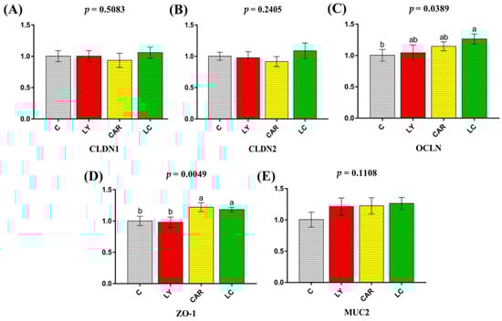 Relative mRNA expression of tight junction genes in the duodenum. (A), CLDN1; (B), CLDN2; (C), OCLN; (D), ZO-1; (E), MUC2. Data are presented as mean value ± SEM (n = 3). Values without the same letter (a, b) represent statistically significant differences (p > 0.05). Abbreviations: C, Roosters fed a basal diet; LY, Roosters fed a basal diet supplemented with 400 mg/kg Lycopene; CAR, Roosters fed a basal diet supplemented with 150 mg/kg L-Carnitine; LC, Roosters fed a basal diet supplemented with (400 + 150) mg/kg Lycopene and L-Carnitine in combination.